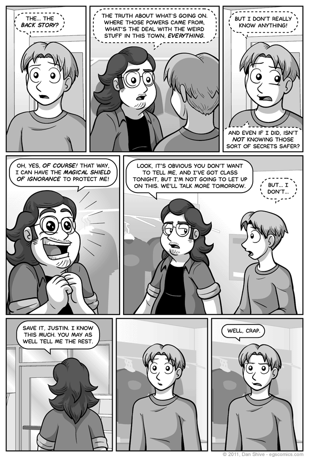 AUGH! KITTY FLASHBACK! KITTY FLASHBACK!I wanted this comic to reveal that George is a community college freshman, but I had trouble finding a way to smoothly sneak that into his panel five dialogue. One version of the script had all that information in there, but it was clunky as a clunk factory. As such, I settled for merely implying that he's a college student.
