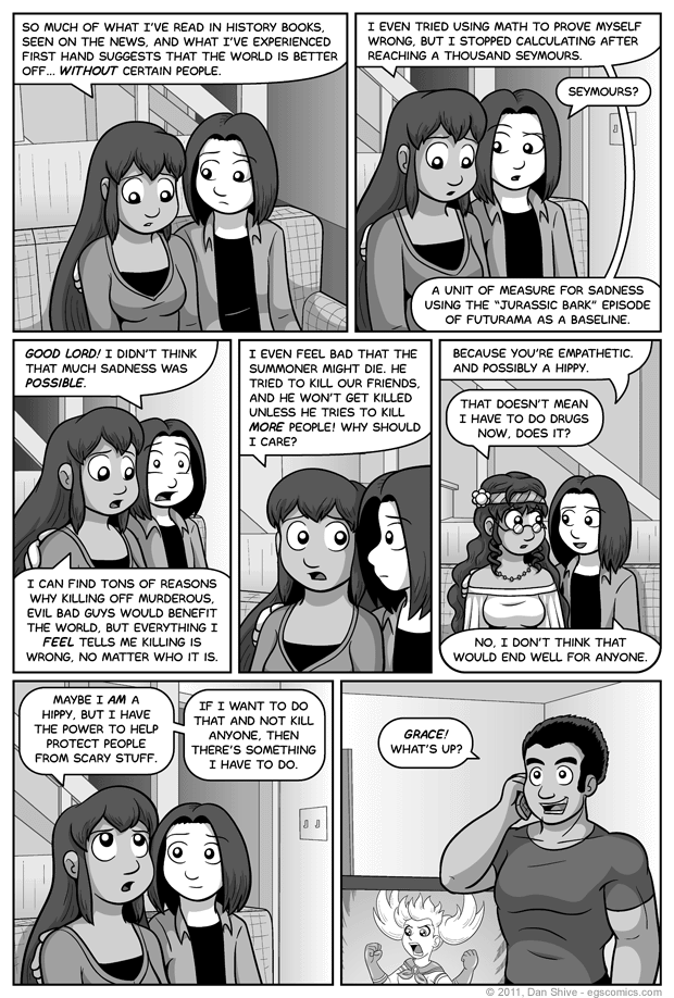 Hippy GraceBefore anyone e-mails me saying I should have spelled it "hippie", I looked up hippy during the production of this comic in the hopes of finding a spelling consensus. I did not, and an online dictionary basically said both were acceptable, so I went with the spelling that looks less weird to me. If you have additional information, that could be neat, but please keep that in mind.