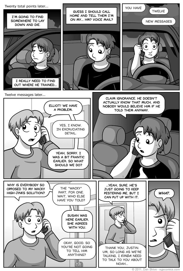 Huzzah.Elliot's possibly jumping to conclusions in panel one. I mean, just because someone's athletic, nimble, and has ridiculous hair doesn't mean they've been trained in some dojo. It's entirely possible that they're some manner of chosen one and/or have a part time job saving princesses on the weekend. I knew a guy like that.. He was nice, but he was annoying to have around at parties because you just knew you weren't going to top his stories.