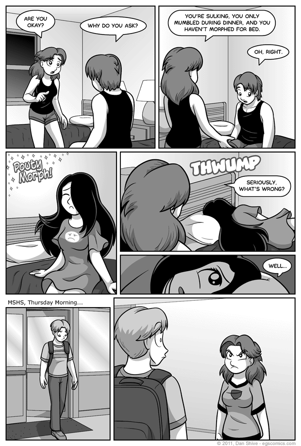 I've generally indicated thick eyelashes in past comics with simply thicker lines for the eyes, but I decided to try out drawing the generic three cartoon lashes on the closeup in panel five. I think that's something I should consider doing more if and when I want it to be visibly apparent that a character is wearing, or at least appears to be wearing, makeup. Elliot's current girly-goth form doesn't have makeup; the lashes just look like there is. The alter-ego form, however, does.
