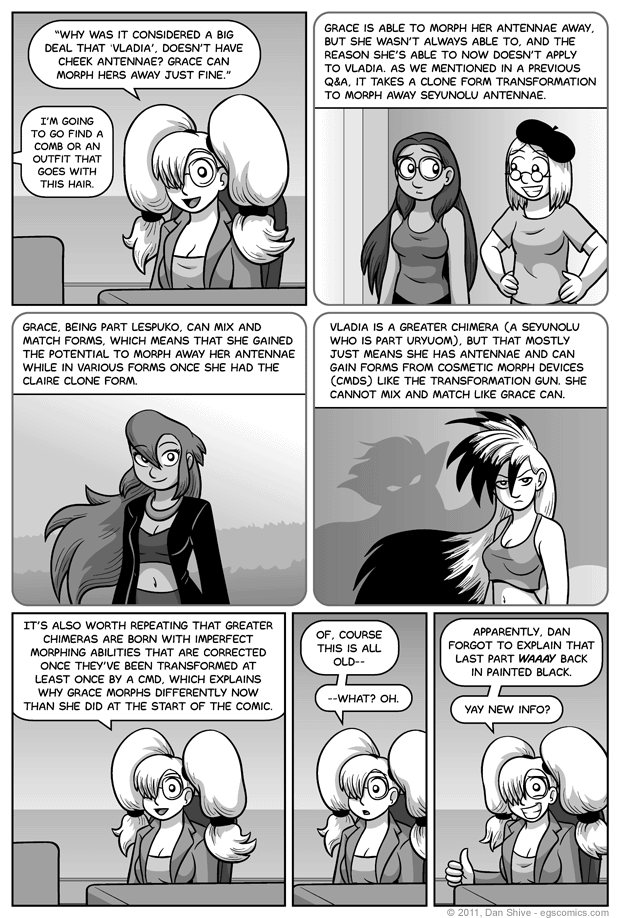 - Grace's "antennae behind the ears" look- Changes to Grace's transformation powers- The introduction of the Claire form- Storyline with the Claire form in that outfit- Making a fuss about Vladia's antennae- Clone forms in Q&A #3I'm still baffled as to what I was thinking with Grace's hair in that first link. Did Sarah cut it, or what? I guess not, because I drew it long here, but gosh darn it, 2002 me! What were you thinking?