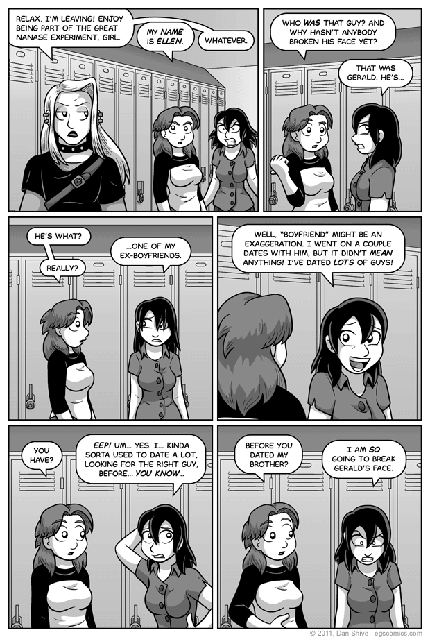 this punching bag.Speaking of which, we here at El Goonish Shive do not approve of the breaking of faces as a method of solving ones problems. We prefer magical transformations and what-not, so really, Ellen dropped the ball here. Magical secrets or no magical secrets, it was zappy time and she missed it, darn it!