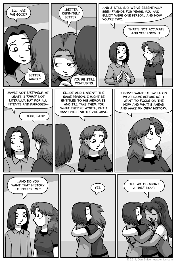Elliot in twain?Tedd brings up a point in this comic previously brought up by several readers that's almost as old as Ellen is (from our perspective). I've gone on record saying that them being one person and then becoming two isn't accurate in a literal since, and that Ellen is a copy (