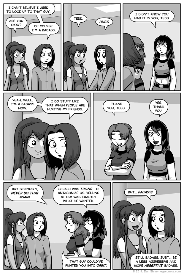 - The legend of Tedd badassery begins- There were hugs then, too- Long ago, when Tedd looked up to Gerald...I MIGHT have taken Tedd's puppy-dog eyes a bit too far in panel two. Not because they don't fit the moment, but because readers of this comic might attempt to hug the screen. Please do not do this. Even if Tedd could feel your hug through the interwebs, there is the chance you could damage your monitor or drop your tablet phone dealie or whatever.