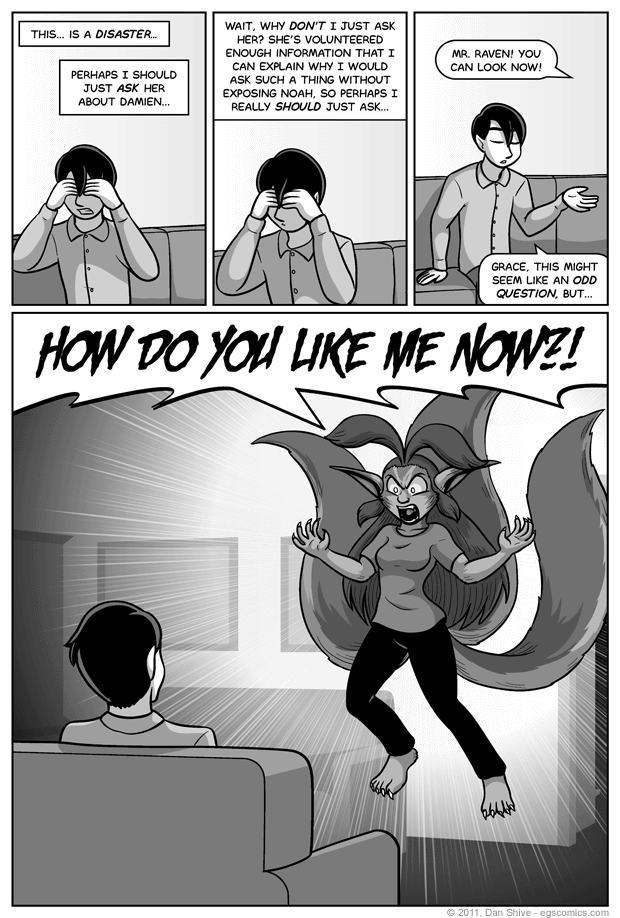 Well, there's at least one reason why Raven's been sticking to indirect questions. Even if he wasn't keeping his source a secret, that is something of an odd question to ask something. I mean, I'm sort of used to it, because I ask everyone I ever meet if they've ever killed a vampire, but I'm sure it would be awkward for most people.