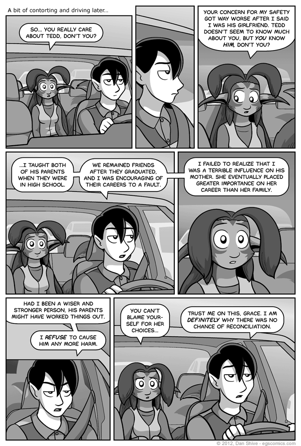 This was an extremely tricky comic to write, because it was really easy to convey too little or too much information through the editing process. The script went from spilling too many beans to too few beans back to an overabundance of beans to no beans to the current amount of beans, which is... four? Four beans? Taught them in high school, remained friends after, encouraging to a fault, feels guilt... wait, that last bean's an old bean. And one could have deduced that he taught Tedd's mom after the reveal that