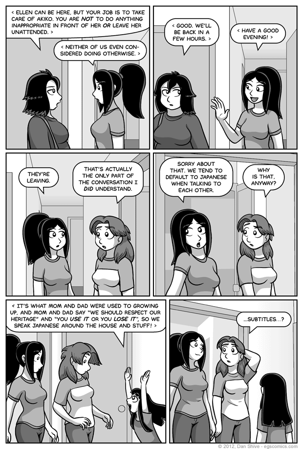 - When last we saw Nanase's motherThe whole "speaking Japanese around the house" dealie is inspired by my own trips to the houses of friends who would speak foreign languages amongst themselves. I am not assuming every household that does this has the same reasons Akiko gives here, but heritage, habit and English being a second, third, or whatever language from their perspective all seem realistic to me.