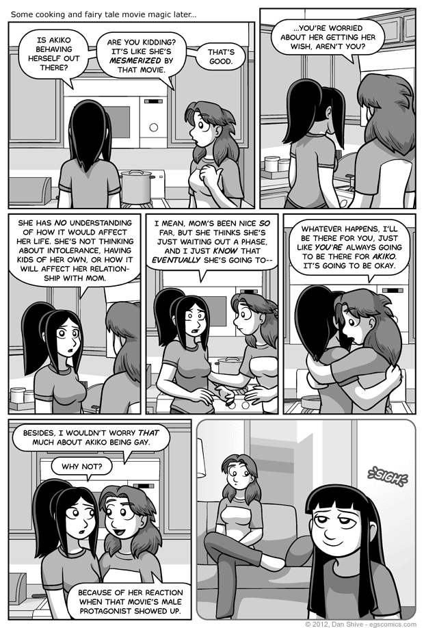 - "Just a phase"CURSE THAT KITCHEN! It is an EVIL kitchen! Well, no, not really. It's just that it makes for a naturally busy background from any given angle I could have chosen. I guess an overhead view wouldn't have been that busy. If I had done that in this comic and claimed it was an homage to 8 and 16-bit era RPGs, would anyone have bought it?