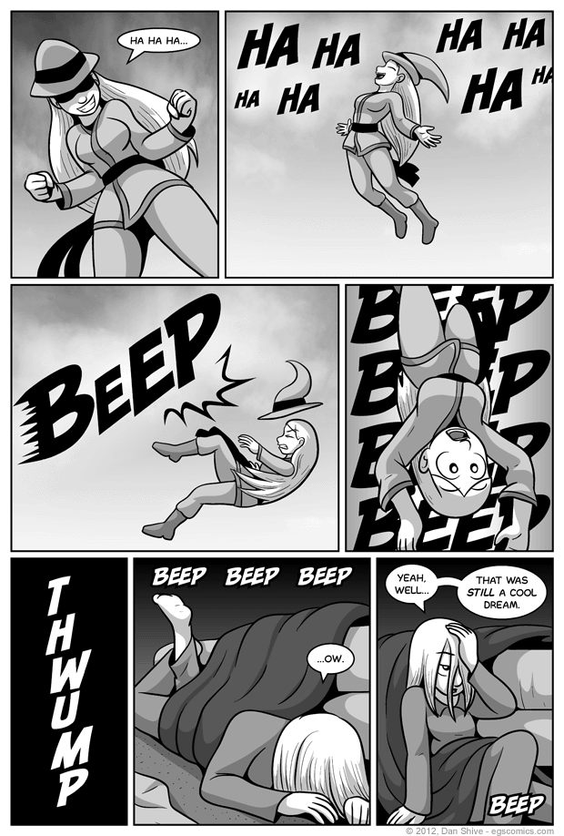 Yeah, I spent the first four comics of this storyline on a dream sequence. What'cha wanna do, fight about it? Oh. You do. I wasn't prepared for that. Well, hang on a moment now, I wanted to give a proper introduction to--WHO THREW THAT SHOE?! This isn't Austin Powers! Honestly. Bah. The comics will speak for themselves. On to wacky behind the scenes stuff. I drew Sarah's relevant poses for this comic in thumbnail, similar to the similar comic. Unlike the previous comic, however, I drew them entirely independent of a layout, knowing only that they were the poses I wanted. The layout was then determined based on those poses and which panel shapes I felt worked best for them. I'm not sure how well that approach would work with a more dialogue heavy comic, but I'm definitely going to try it, as I think this approach resulted in more dynamic poses positioned better in the panels than I would have otherwise achieved.
