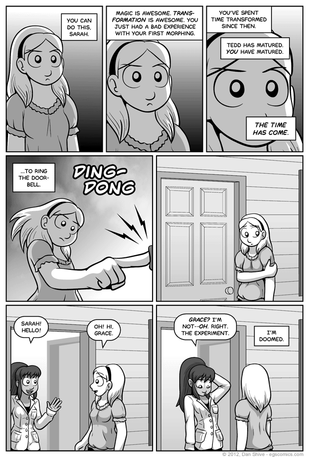 - First morphing- Time spent transformed- Tedd maturing- "You wouldn't happen to need a lab assistant this summer...?"Give yourself some manner of treat if you knew that was actually Tedd before panel seven.