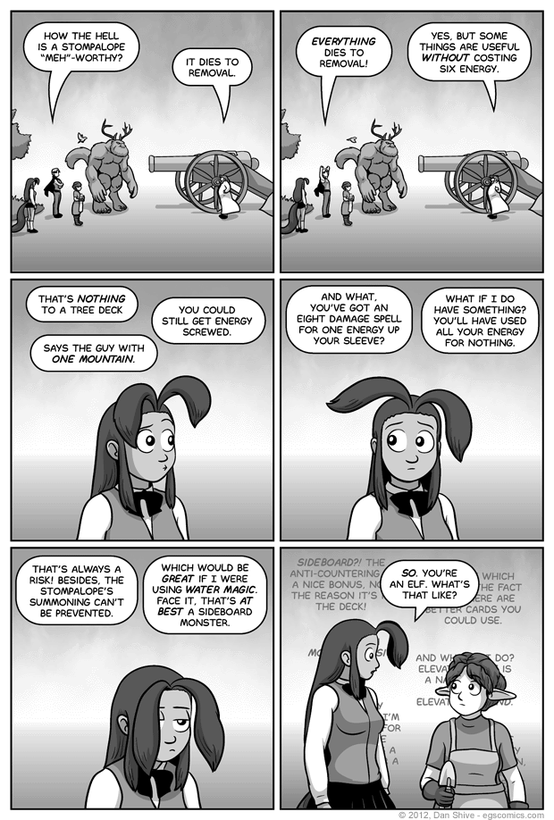 The Stompalope is inspired by an actual Magic: The Gathering card. Well, the card's abilities and the inclusion of the word "stomp" are. The visual design, the alope-ishness, the chin to rival Batman, etc., are all me. Nonetheless, the inspiration to design such a beast came both from my using the card that inspired it and the very real (and somewhat tiring) debate about how good that card is.