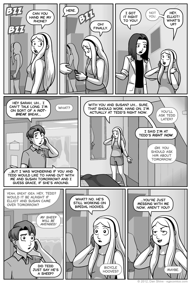 Of course, I have an excuse for those who demand continuity line up perfectly. For one, Sarah's in the corner of a basement, which I've found capable of affecting reception. For two, Elliot's outside the rental shop, so there could be wind blowing into the phone. Those two factors combined means that Elliot would have even more trouble understanding people on the phone than normal. ALL THE PIECES FIT!