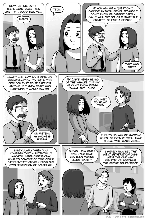 Speaking of Elliot, I'm not sure if he entirely comprehends what he's saying in panel six. It's entirely possible that he had a bunch of random technobabble just floating around in his mind and he happened to pick the one that was actually relevant.