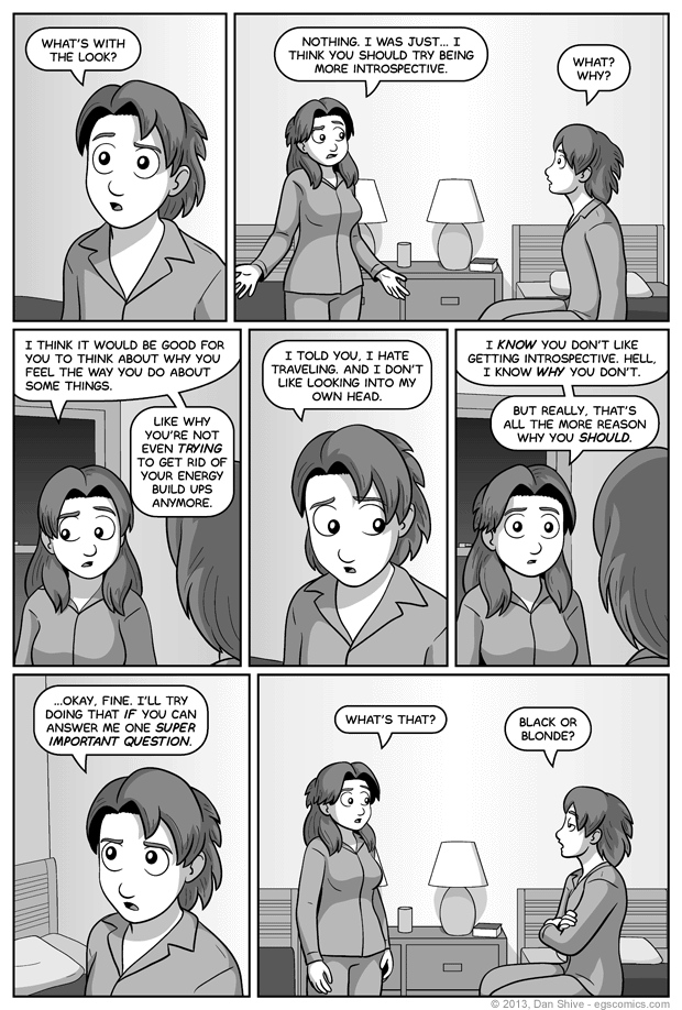 There actually are vague indications of the reason why Elliot doesn't like getting introspective in the archives, but what are they? HA! As though I'd reference link the appropriate comics prior to Elliot actually getting introspective, and that could takes weeks! Months! YEARS! Or tomorrow. You know, whenever. And now for alternative comic dialogue theater: Ellen - "What look? This shocked look in response to saying you felt like you were cheating on Susan at times? I wasn't reaching any sort of conclusions about what sort of feelings you may or may not have for her. I was thinking about that other thing. From before. That's not related. Let's talk about that again." Elliot - "I totally believe you."