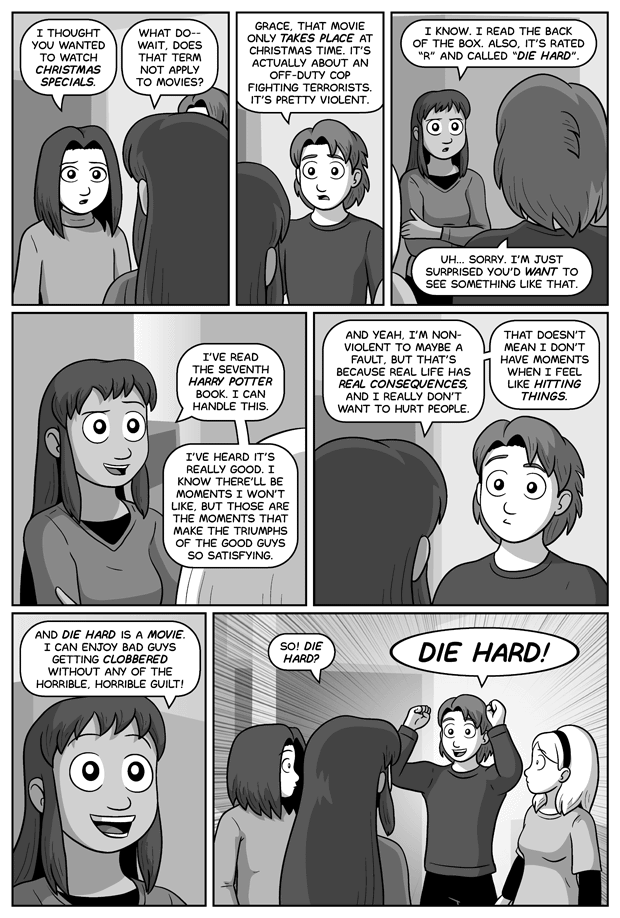 I felt like I needed to watch Die Hard again prior to writing this comic, so I did. It's a really good action movie, particularly in terms of character and pacing. As such, I don't regret watching it again, but I really could have skipped doing so as far as writing this comic is concerned. Given the context, not much would have changed in this comic had I gone with any other good action movie with an "R" rating.