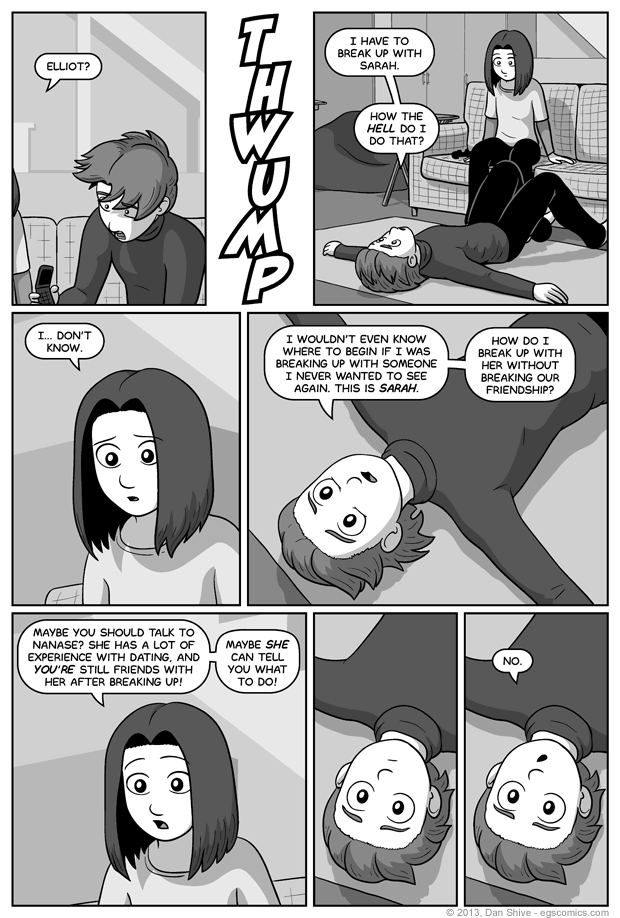 I wound up redrawing the third and fourth panel (assuming "thwump" counts as a panel) because the position Elliot originally wound up in would have required him to fall on the floor and then awkwardly reposition himself about ninety degrees to his left. He might not be exactly where he would have landed in the final result, but I like it.
