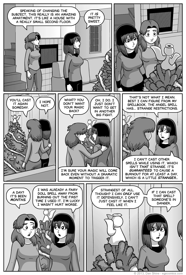 - Nanase casting her first of many spells the day Abraham attacked- Angel Nanase- BurnoutIt took me a while to figure out how to stage the first panel for this comic, mostly because I originally imagined it from a different angel--er, angle. I wanted imagery that went with what Ellen was saying, but I was trying to sort out the viewing angle from by where they'd been standing (you can see
