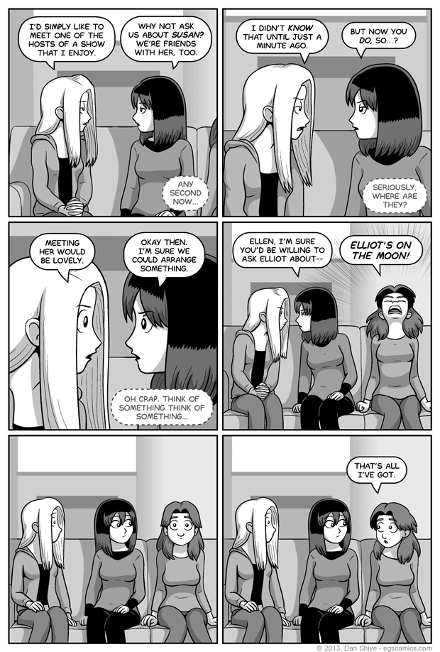 I bring this up in defense of Ellen's failed strategy in this comic. Sometimes, saying something truly bizarre can save the day. This was not one of those days. If I may critique her approach, the idea is to change the subject entirely, not make some excuse that cannot possibly be... Actually, in this comic, it probably would be possible for him to get on the moon somehow, but it's not very likely or true, now is it?