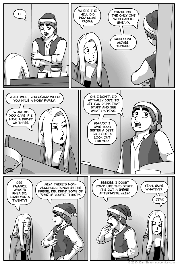 It never fails. No matter how sneaky you might think you are when sneaking to the punch bowl, you can always count on there being a guest you didn't see. I assume this is a common occurrence, in any case. From a production standpoint, this comic was a nice refreshing treat after the previous comics. Only two characters, each of them not visible or only partially visible in some of the panels... It was like taking a break. Well, as time consuming as it might be to include all of these characters, at least I have a bunch of new extras! College age extras! That I won't be able to use in any given high school situation that might be coming up with tons of characters in them! ...Well, nuts.