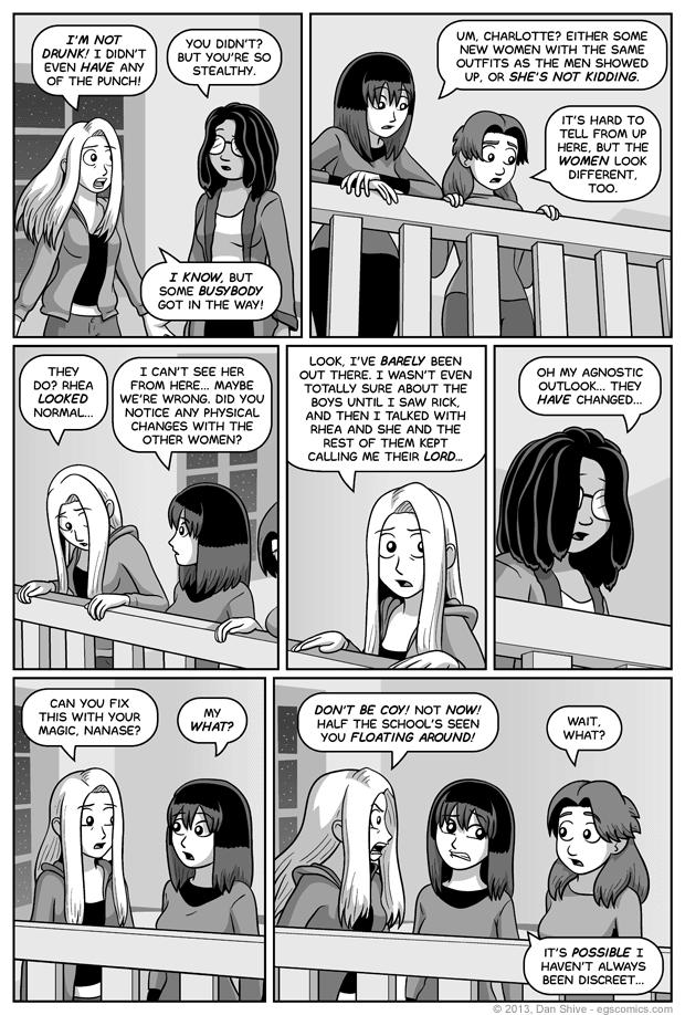 The railing in this comic is prrrrretty tall, and that's the result of my mind doing what it does best: Fretting over things that don't matter! I was just thinking about this railing being the only thing standing between the top floor and the living area below, and it never seemed high enough to me. I kept thinking "if this were real, that could be super dangerous. What if someone leaned over too far, or tripped! That's basically just a room with a ledge up there! Think of the hypothetical people who could get hurt!"