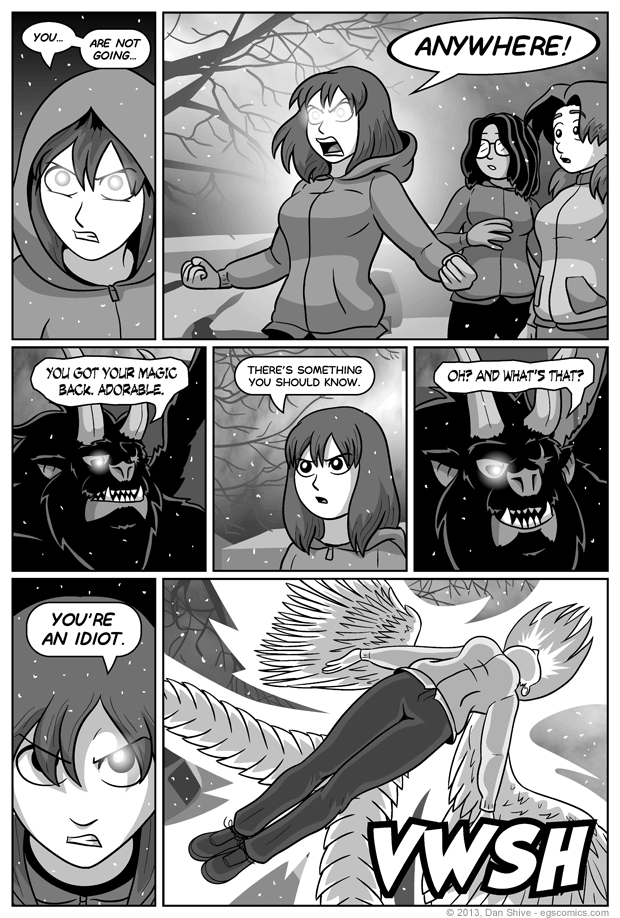 - First casting of the angel spell- First full view of the angel form- Her magic came back?! THAT was never foreshadowed!- Not one bit- Seriously, her getting it back just came out of NOWHERENot-Tengu sort of makes me think of a stereotypical hipster in this comic. "Hm. I see you're using THAT sort of mainstream magic. I only use all natural evil magic, but you've probably never heard of it."