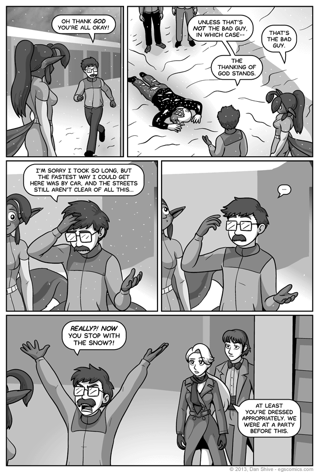 It was fun to dress Wolf and Cranium for this comic. Granted, Cranium's outfit isn't that much of a diversion, or rather it isn't much of one so long as she's wearing that coat. The dress she's wearing under there is definitely not work or winter appropriate. As for Wolf's tuxedo, well... What else was I going to have a man wear that's dressed up but not common? We don't have as many options, and bow ties are cool.