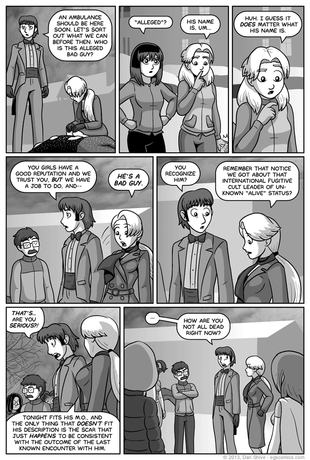 With several characters in a scene who aren't standing close to each other, it's natural that not every character present is going to be shown in every panel, or even every comic. All the same, I found myself wanting to avoid the feeling that characters were vanishing, and decided to make it a goal to show everyone present at least once in this comic.