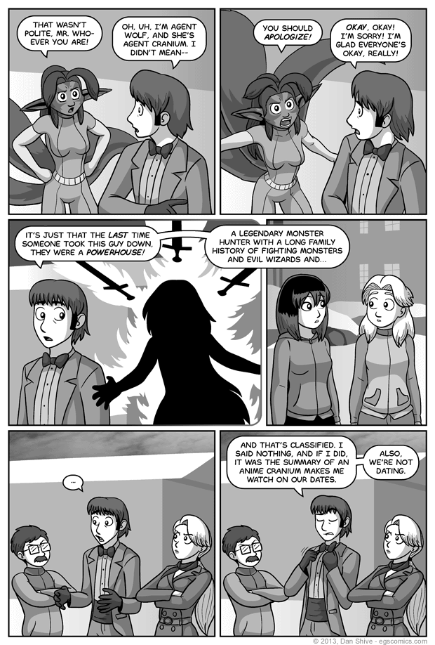 Grace was originally going to immediately address Agent Wolf by name in this comic, but then I thought about it, and they've never actually met before now. I guess that's not a big reveal or anything, but at least it gave me an excuse to clarify who they are for anyone who might've been confused and not big on reading comic commentaries. YOU'RE WELCOME, those people who are not reading this.