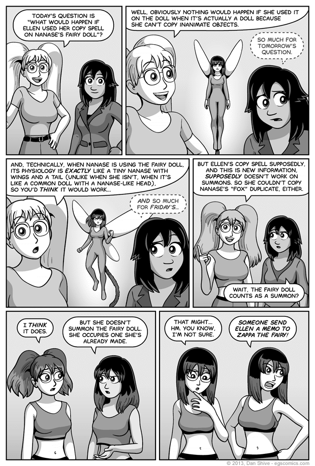 This comic may well have failed to answer the question is set out to answer, but it did answer two other general questions, namely "can Ellen copy inanimate objects" and, well, various questions about the physical nature of the fairy doll I received after the end of the last storyline. I hope panel three answers those questions satisfactorily, because I don't plan to elaborate further.
