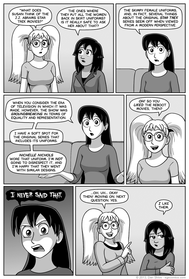 In any case, the newest Trek movies are lacking several of the key elements that make Susan love Star Trek, so she does not care for them. As this comic addresses. however, this dislike has nothing to do with the revival of the old uniform styles. Speaking of which: Nichelle Nichols.