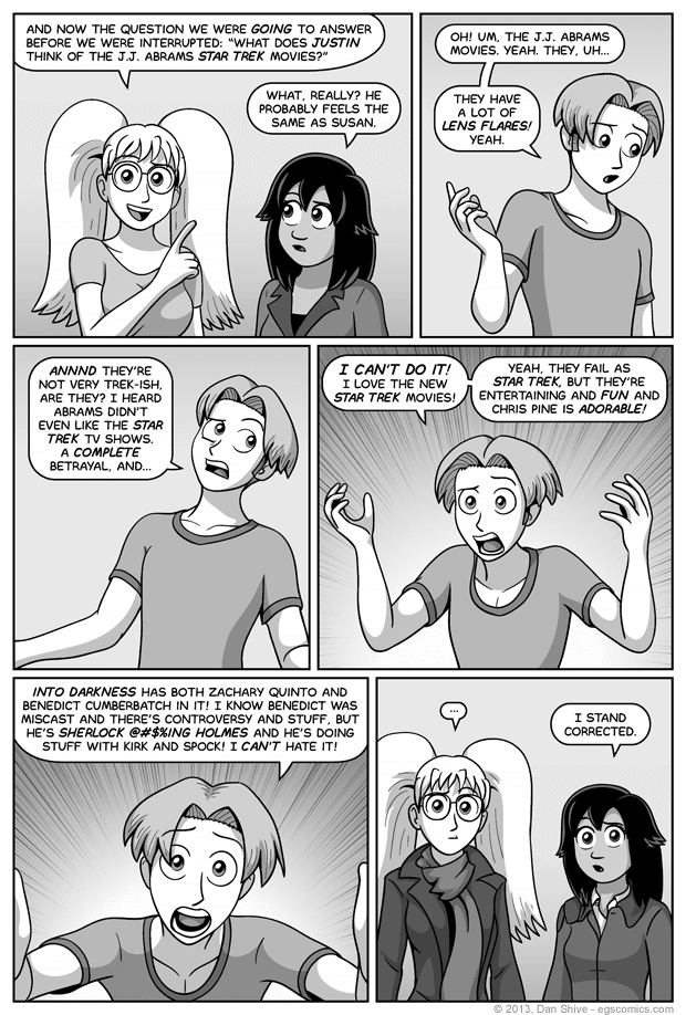 Justin likes Star Trek too, darn it! He's also into a wide variety of "nerdy" things. Justin can more easily appreciate guilty pleasures than Susan can, and he's also more likely to check out whatever's popular in geekdom at the moment because you can bet whatever it is, he's had to hear about it while working at the comic shop and will have it least given it a quick look if for no other reason than to have some idea of what the heck everyone is talking about.