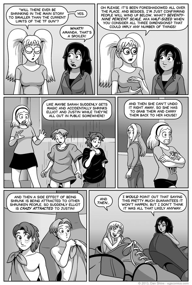 Incidentally, we're bound to be a loooong way off from another Q&A after this one (it was over two years between the last one and this one), but if we reach that point and I say "I'm going to keep it simple by just having Amanda and Lisa standing in one spot" again, SLAP ME. I'm tempted to draw them in some manner of elaborate obstacle course next time just to guarantee I don't get tired of drawing them.
