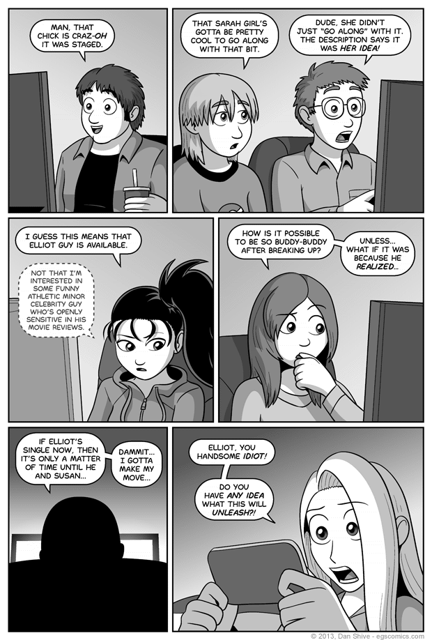 I know nothing about the dude in panel one. He exists solely to be the dude who almost took the review seriously. All the same, I want him to return. I will find things for him to comment on, dammit, and--And I could've sworn I drew stubble on his chin. That chin is NOT supposed to be shaved. Maybe I can correct before--Wait, no. It's already part of the commentary! NO! THERE IS NO SOLUTION TO THIS PROBLEM! IT WOULD CAUSE A PARADOX!