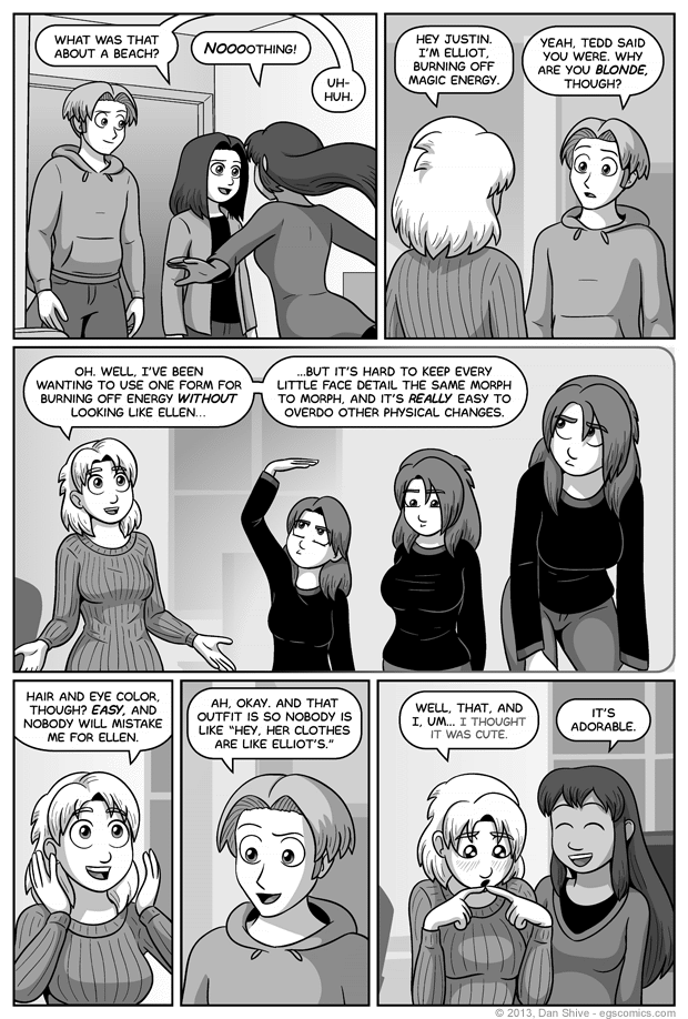 Anyway, FINALLY, an explanation for blonde Elliot! An explanation that's actually super simple, really. The bigger mystery is what's up with the second example of "overdoing it" in panel three. Did Elliot really consider that at one point? Surely he must have, or else it would be completely gratuitous, and I would never include such a thing.