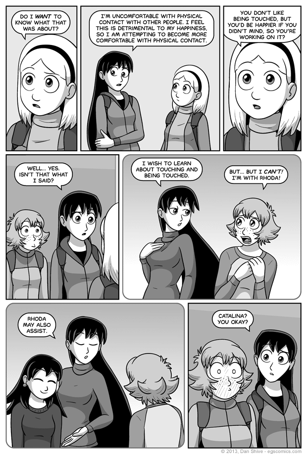 I definitely wanted Catalina to have a reaction to Susan's quest, but I originally just thought of one panel where she offers her own head to be pet. Thing was, A) I didn't have enough panels to fill the rest of the comic prior to that one panel, and B) Catalina's motive for doing that would be her attraction to Susan, which means she wouldn't do it. Catalina made her kissing mistake with Elliot in part because kissing Elliot didn't mean anything to her. Trying to get a pat on the head, however, would be like flirting to her, which is a whole different deal.