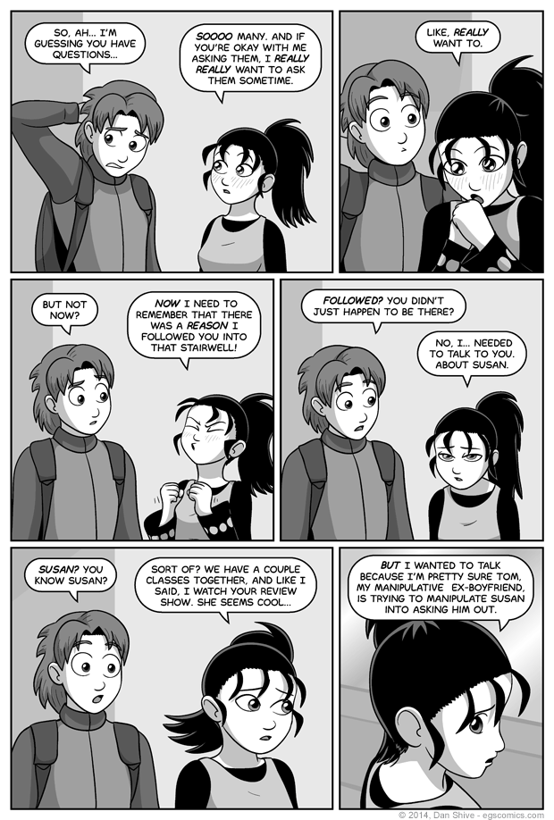 I believe I've pointed it out previously, but you can spot Ashley in the background of panels four and five of this comic prior to Elliot transforming (recognizable by virtue of distinct hairstyle). In that comic, she was sitting at a table when she noticed Elliot in panel four, and she's on the move in panel five. Elliot presumably passed her on his way to the stairwell.