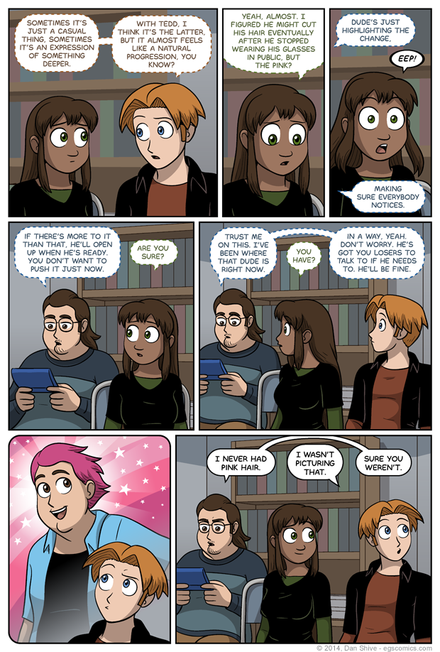 El Goonish Shive Introductions The Goo Shade, Part 1 Q&A #1 Shade, Part 2 Relations, Part 1 April Fools Week Relations, Part 2 Catnip Sister Part 1 - Open The Box Part 2 - Read The Rules Part 3 - Set Up The Pieces Part 4 - Play The Game Part 5 - Knock The Board Over Part 6 - Scattered Pieces Part 7 - Fist Fight Part 8 - Clean Up New And Old Friends Flipping Cardboard Lady Mysterious II slooF lirpA Squirrel Diplomacy Lunchtable Revelations Night Out Part 1 - Martial Arts Crew Part 2 - Elliot's Crew Part 3 - Ellen's Crew The Morning After Q&A #2 Tam Eh Tedd Painted Black Part 1 - Walk In The Park Part 2 - Missing Persons Part 3 - Interviewed By The Devil Part 4 - Into The Dungeon Part 5 - The Truth About Grace Part 6 - The Brewing Storm Part 7 - Fallen From Grace Part 8 - Humanity PB Special Features Shadows After Dark Sleepy Time Second Life The Child Left Behind Red Alert Before The Party Moping Squirrel Intro to South Party Recruiting Even More Recruiting Party Fashion Family Reuinion Grace's Birthday Party Part 1 - Arrivals And Presents Part 2 - Bending Genders Part 3 - Festivities Part 4 - Hold On Hope The After Party Q&A #3 Hidden Genesis Hidden Genesis In The Shadows The New Students Susan Draws The Line Squirrel In The Classroom Sister 2 Part 1 - The Trials Of Susan Part 2 - The Statue Part 3 - Pent-Up Magic Part 4 - Evil Monkey Part 5 - Moperville News Part 6 - Weregirl Part 7 - The Dark Clouds Gather Part 8 - Talon vs. Scythe Part 9 - Wrath of God Part 10 - Pandoras Box Q&A #4 Q&A #4 Bringing Silly Back Indiana Elliot And The TOSF T-Minus The Demon Ally Hammerchlorians - 1 Hammerchlorians - 2 Hammerchlorians - 3 T-Minus Dark Allegiance New And Old Flames - 1 New And Old Flames - 2 New And Old Flames - 3 New And Old Flames - 4 New And Old Flames - 5 New And Old Flames - 6 Q&A #5 Q&A #5 9001% Serious One Way Road Legends of Celida Death Sentence - 1 Death Sentence - 2 Death Sentence - 3 Death Sentence - 4 Death Sentence - 5 What Is Love Summer The End Of Spring Power Fantasy Rocks Fall Nobody Is Hired Nepotism Hair By The Numbers Duel Of The Discs There Be Whales Here There Be Whales Here Pt 2 There Be Whales Here Pt 3 The Dawn End Of An Era End Of An Era pt 2 Family Tree Family Tree Part 2 - Arrival Family Tree Part 3 - Par-TAY Family Tree Part 4 - Weirdness Family Tree Part 5 - A Troll Family Tree Part 6 - Banhammered Family Tree Part 7 - Hangover Q&A #6 Identity Identity Part 2 - Reactions Identity Part 3 - Cat Attack Identity Part 4 - Detective Sarah Identity Part 5 - Basement Chat Identity Part 6 - ILLOGICAL! Identity Part 7 - Dreams identity Part 8 - Ashley Identity Part 9 - Detective Susan Identity Part 10 - Ashley and Elliot Identity Part 11 - Epilogue Summer Moments Guest Comics Guest Comics #1 Guest Comics #2 Pandoras Box Squirrel Prophet SP - Part 2 SP - Final Battle So A Date At The Mall So A Date - Part 2 So A Date - Part 3 So A Date - Part 4 So A Date - Part 5 EGSNP - Question Mark Q&A 7 - The Requestioning Sister 3 - Catspaws Part 1 - Legacy Part 2 - The Will of Magic Part 3 - Reply Hazy Part 4 - Everyone Needs To Talk Part 5 - The Reservoir Part 6 - Maybe Sisters Part 7 - An Unkindness Part 8 - Awkwardness Ahead Part 9 - Traffic Freeze Part 10 - Fluidity Part 11 - All Of The Curse Words Part 12 - Misanthropy Part 13 - In Search Of Wisdom Part 14 - Sister Anxiety Part 15 - Elliot and Ellen Part 16 - BFFs Part 17 - Great Fairy Godmother Part 18 - Gathering Monsters Part 19 - Family Meetings Part 20 - Geminis Part 21 - The Other Dunkel Part 22 - Apocalypse Part 23 - The Fate Of Magic Part 24 - Elliots And Ellens Part 25 - Changes Part 26 - Epilogues The New World The Legend of Diane The Secret of Sam Q&A 8 - The Lord Of The Q&As Title Pending Title Pending 2 - Even More Pending Title Pending 3 - Untitled Party Title Pending 5 or 6 Balance Part 1 Part 2 Part 2-B Part 3 Part 4 Part 5 Part 6 Part 7 Part 8 Part 9 The Road Ahead Brother Father Our Future Recruitment Layers, Part 1 Layers, Part 2 Layers, Part 3 Layers, Part 4 Hope, Part 1 Hope, Part 2 Hope, Part 3 Hope, Part 4 Hope, Part 5 Hope, Part 6 Hope, Part 7 Hope, Part 8 Hope, Part 9 Hope, Part 10 Hope, Part 11 Hope, Part 12 False Kings False Kings, Part 1 False Kings, Part 2 False Kings, Part 3 False Kings, Part 4