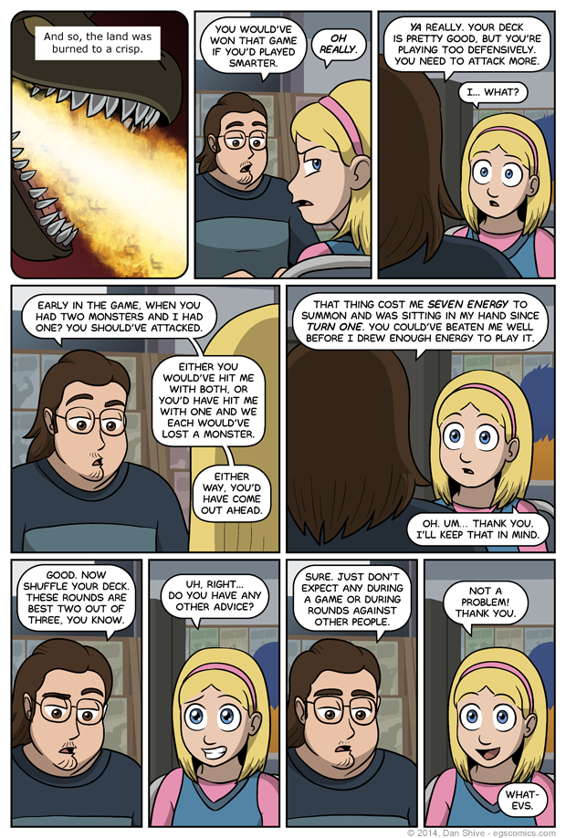 One reason that George provides a reminder that the rounds are best two out of three is that people have been asking about that after the most recent comic with Luke. I find not remembering understandable given time between updates and how many comics it has been, but behold the tournament rules as told by Justin. Rounds are best two out of three, and they get to keep playing regardless of their overall win/loss record.