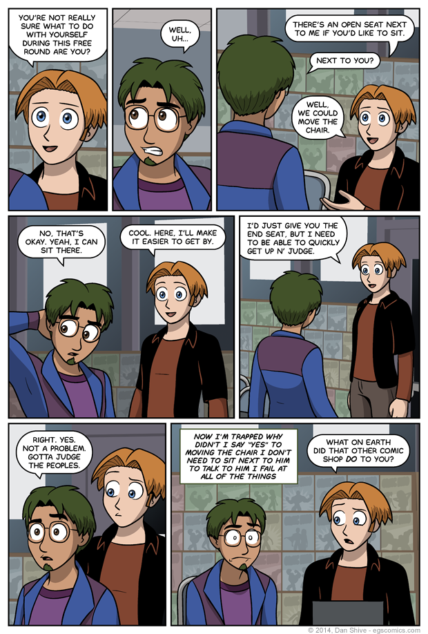 This comic is basically the result of me trying to figure out where the heck Luke was going to be while talking with Justin. I mean, that isn't all there is to it, but I did finally decide "Luke has to sit down and he has to be next to Justin it'll be awkward if Luke stays standing and limiting if he sits across from Justin he has to sit back there get him back there GET HIM BACK THERE NOW"