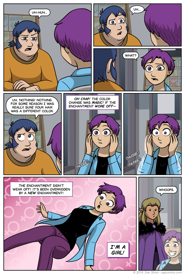I had several reasons for showing an androgynous female Tedd earlier in the genderfluid comic. For one, I'd decided that Tedd's default female form should be as androgynous as her male form. For another, I wanted to establish that prior to this moment, giving people a chance to guess at it before the reveal.