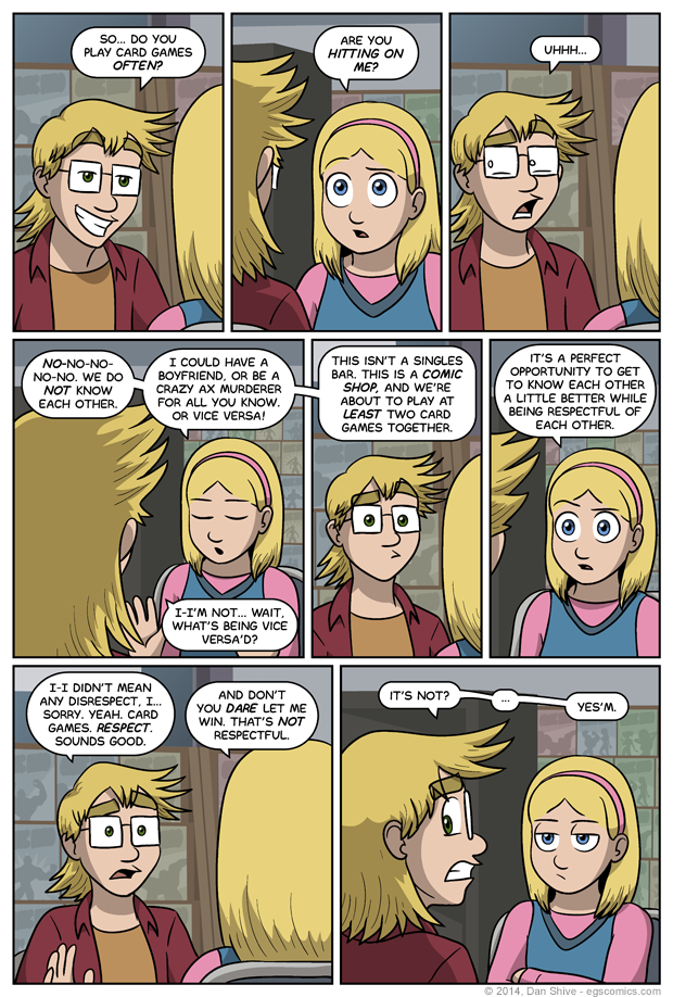 One might conclude that Sarah is telling Larry not to let her win because of what happened with Larry and Tedd, but no, Sarah doesn't know about that. She is, however, a girl who likes playing games. She's been "given" victories before. Granted, I shouldn't assume that all women have had to deal with guys letting them win at games, but I'm going to assume all women have had to deal with guys letting them win at games.