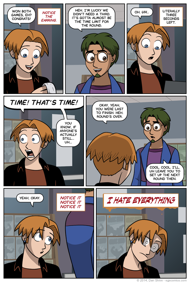 If you look closely at last Friday's comic, it's pretty obvious that Luke didn't notice the earring. Of course, if you have to look closely, maybe calling it "obvious" is wrong by default? Well, in any case, Justin's earring was totally, and intentionally, absent from Luke's fantasy. Give yourself all sorts of praise if you realized that prior to reading this.