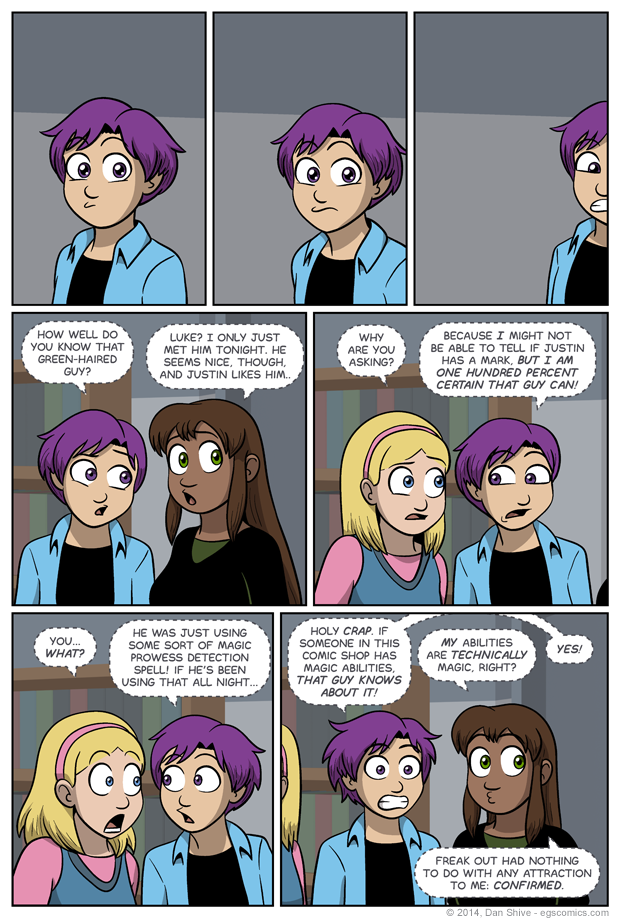 I like the first three panels a lot. I'm sort of disappointed the entire comic isn't Tedd just very slowly making his way back to further behind counter, but there was stuff to exposit, so bleh. Probably for the best.