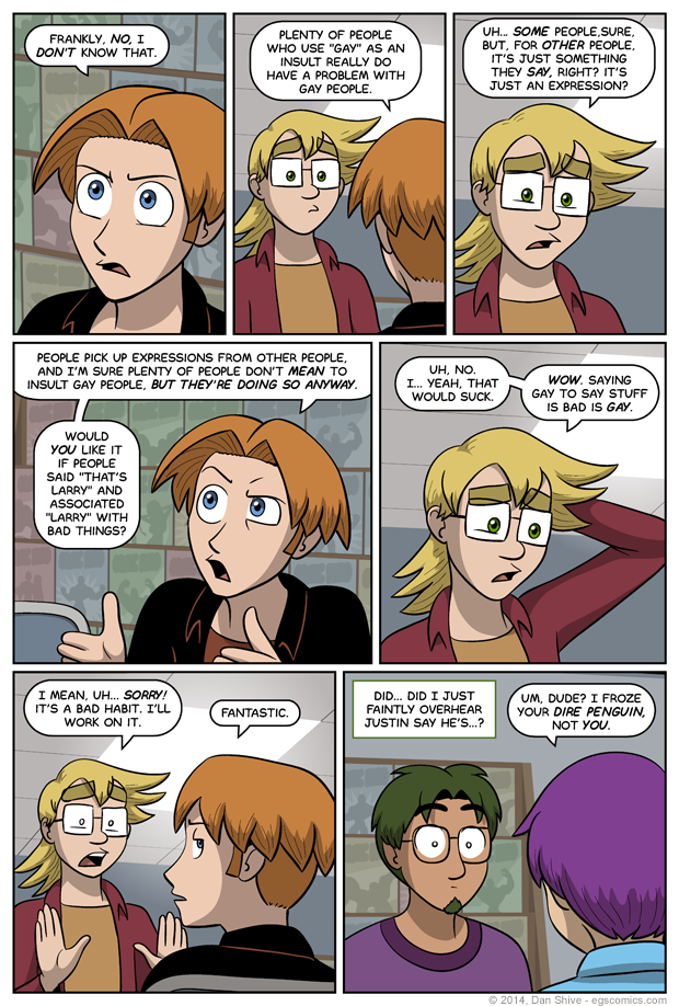 One may get a bit of Deja Vu from this comic on account of a previous scene with another comic shop patron who realized it wasn't really cool to be running around saying "gay" as an insult. There are a few reasons why I'm addressing it again that go beyond giving Luke something to faintly hear over the various people playing card games.