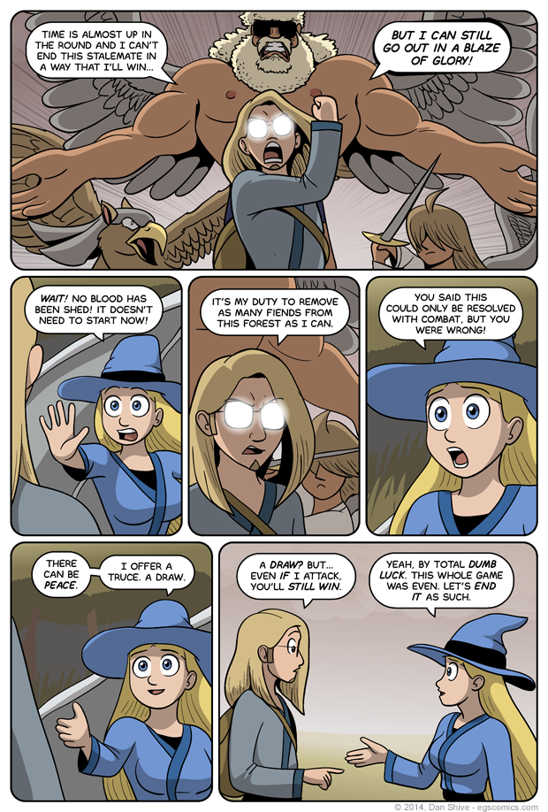 I expect mixed reactions to this comic, particularly from people who play card games competitively. Is agreeing to a draw a thing you can do in most tournaments? Is it acceptable to even propose such a thing? What are the stats of that super rad griffin?