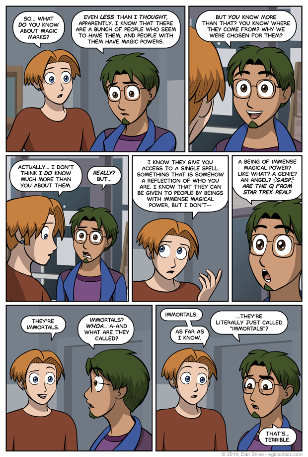 Incidentally, I'm currently scheming to go back to Mon-Weds-Friday story comics for a bit starting next week. I VASTLY prefer five a week so I can get away with my preferred pacing, so I don't intend this to be a permanent change, but it may last a several weeks. I need to regroup somewhat and get a lot of things I've fallen behind on done while organizing for the storylines after this one.
