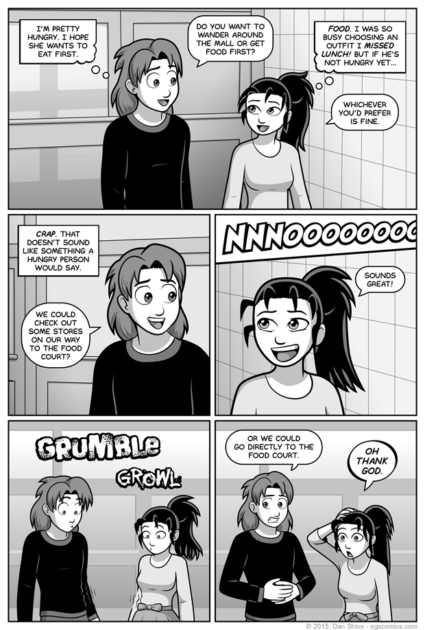 An early version of this exchange involved Elliot and Ashley each having a snack in anticipation of the other potentially not wanting to get dinner right away. It was similar in a lot of ways, but I like this one better. Plus I decided I wanted them to get food first, darn it.