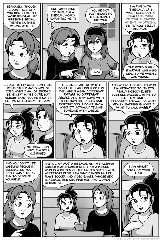 Way back in 2006, I made a couple of choices regarding the word bisexual that were basically based in ignorance, and the main issue on my end was actually one of the reasons Ashley takes issue with labels: I was treating "bisexual" as though it had one very specific definition, and that any deviation from that definition meant technically not counting as bisexual. This resulted in Grace claiming she wasn't.