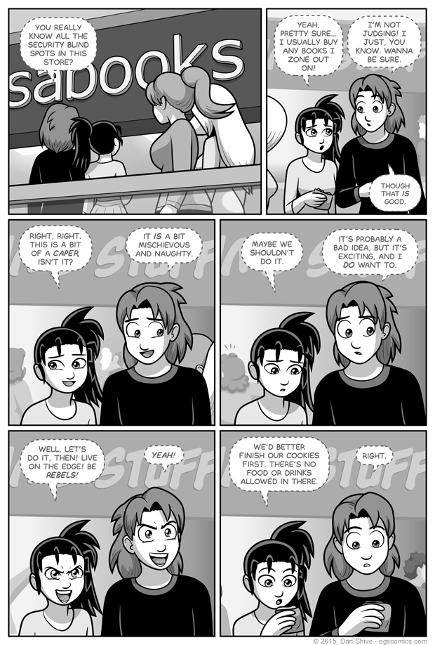 That store the entirely unfamiliar background character is so interested in is simply called "Anime Stuff". I tried to make that more obvious, but it didn't work out. Heck, part of me wishes I should put another divider with plants behind Elliot and Ashley in this comic, but darn it, those aren't EVERYWHERE in this dang mall, and in my mind this book store is on a second floor by some railing, a view of the first floor from above, and other stores on the opposite side.