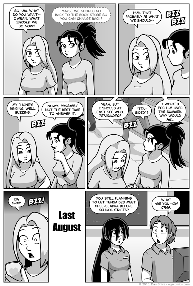 I was originally going to have Elliot's ringtone be the Imperial March from Star Wars, but acknowledging it was clunky, and the "dun-dun-dun dun-DAH-dun", etc, called for a lot of panel space, so I decided it was set to vibrate. Makes sense given that they're on a date in a mall and the vibrating would actually be harder to miss, but it's not quite as fun.